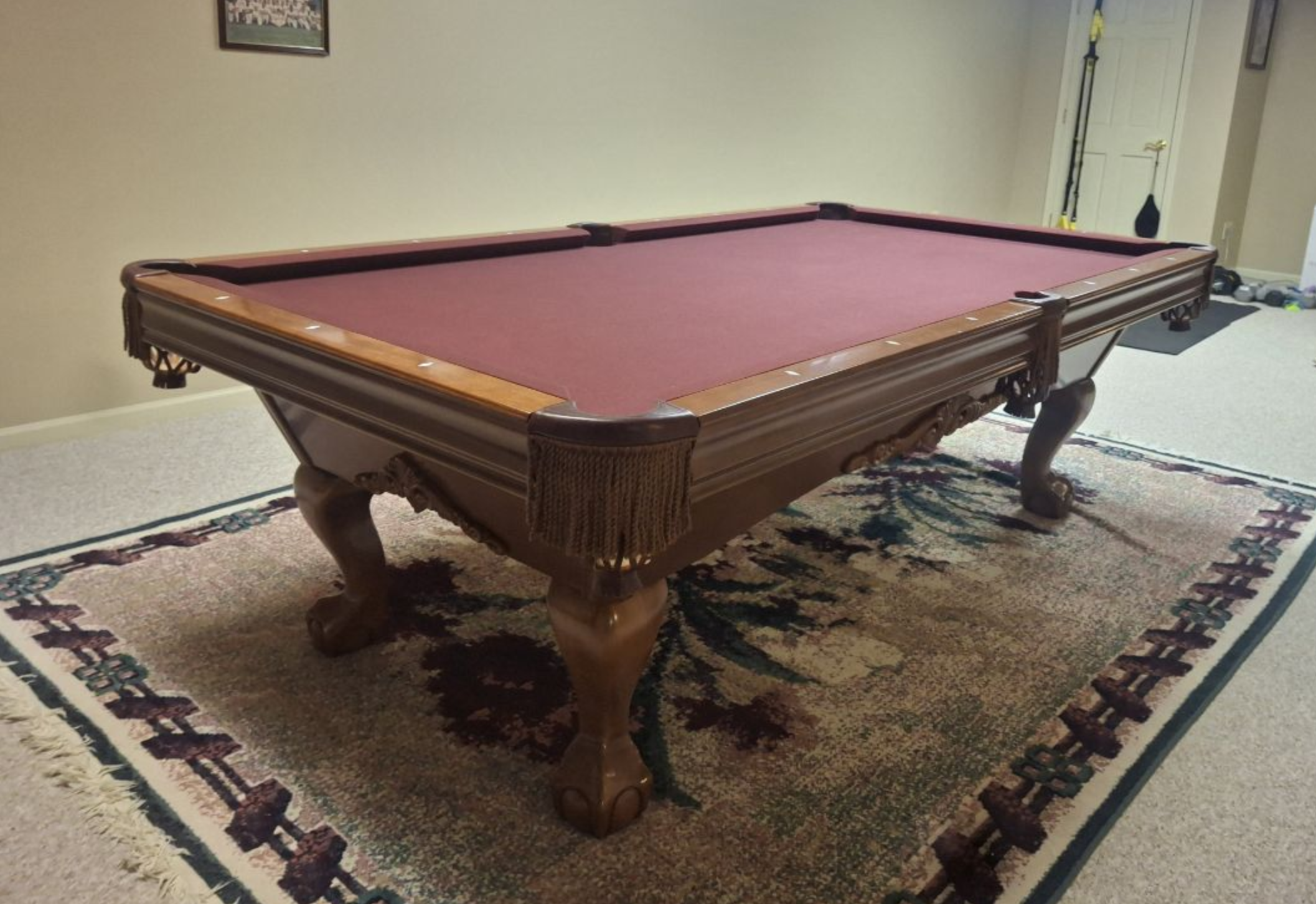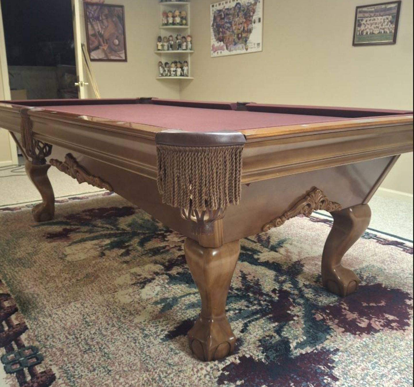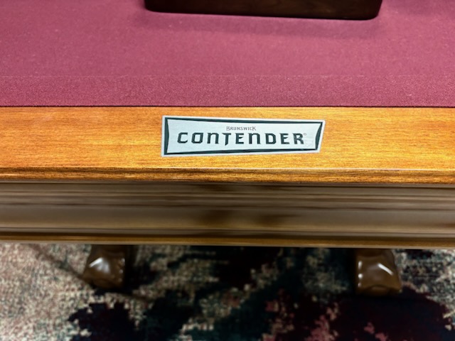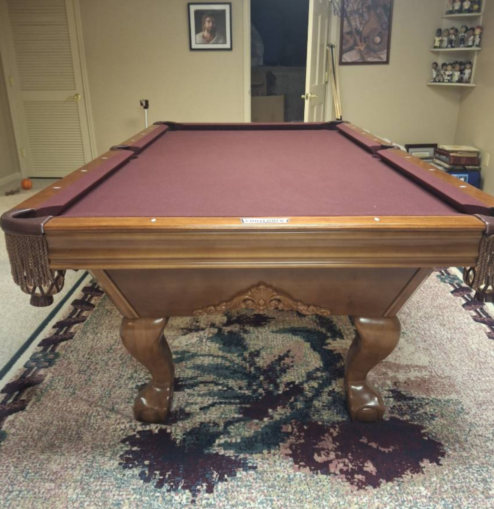 A gorgeous, high-end Brunswick pool table in excellent condition. Features luxurious styling, beautiful craftsmanship, and a rich golden brown finish with classic Ball & Claw legs — an eye-catching addition that elevates any game room.