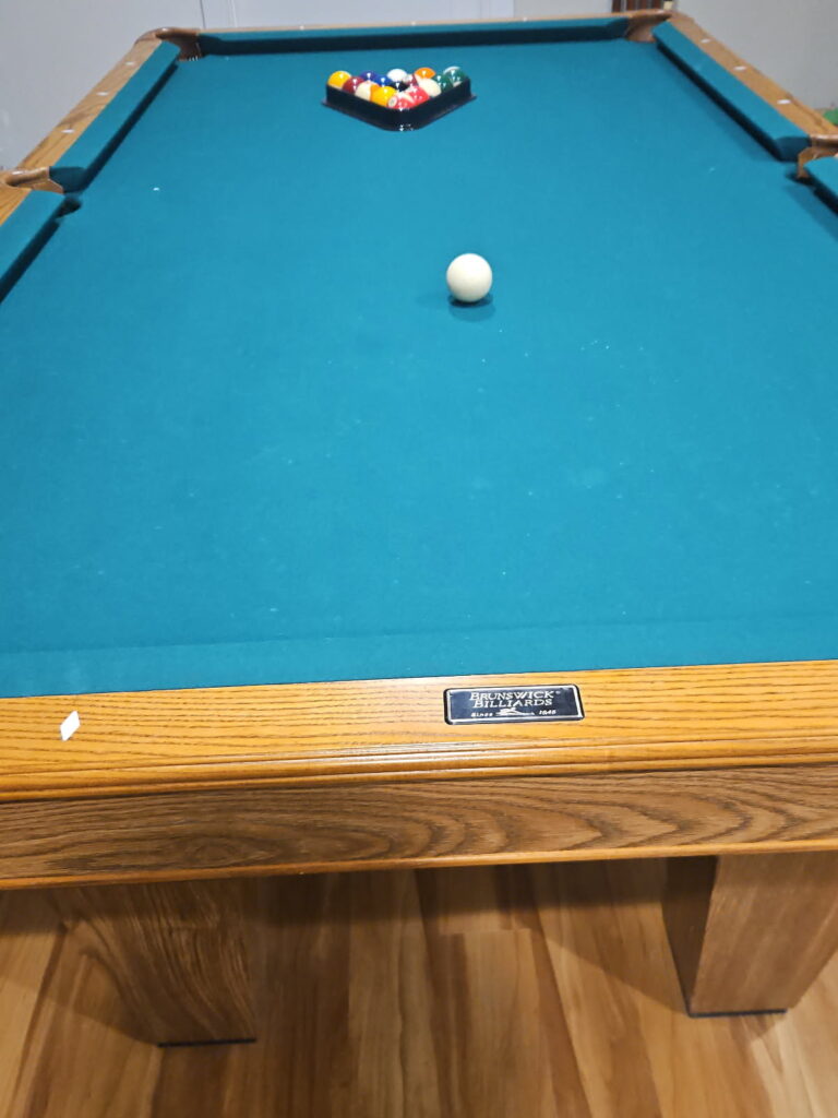 A gorgeous, high-end Brunswick pool table in excellent condition. Features luxurious styling, beautiful craftsmanship, and a stunning oak finish with elegant tapered legs — a refined centerpiece that enhances any game room.